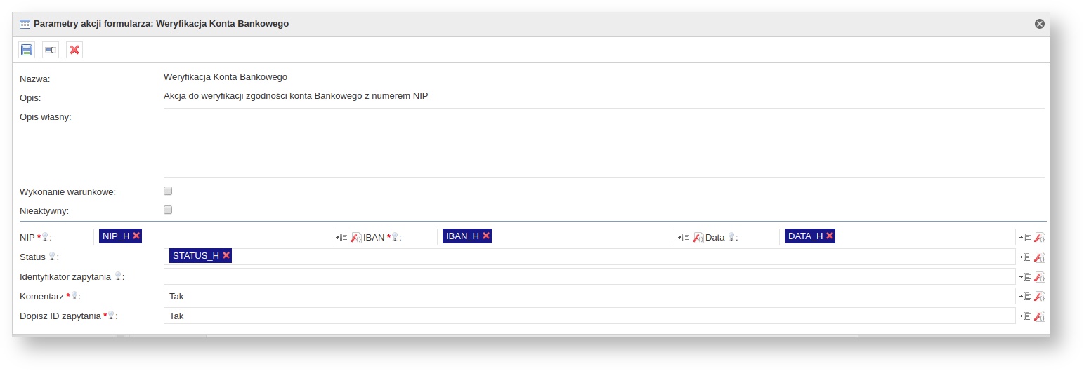 | Status | 1.0.0 | Zmienna do zapisu zwróconego statusu (TAK/NIE/Informacje o błędzie) | Zmienna tekstowa | Gdy nieustawiona parametru, informacja będzie zwracana w postaci chmurki na formularzu | |