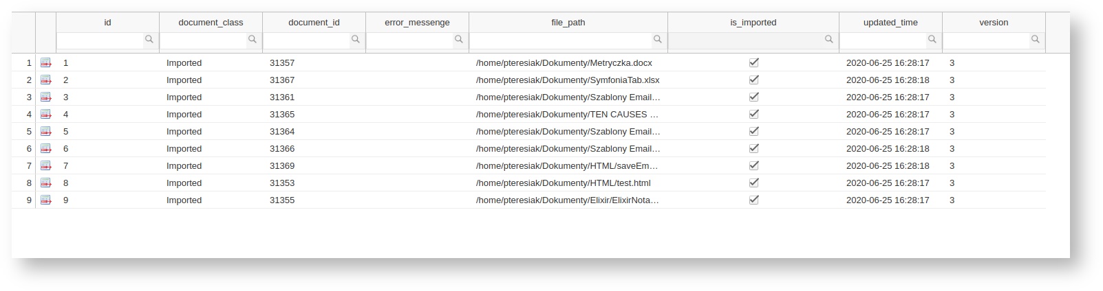 Tabela przechowuje informacje o importowanych dokumentach (udanych importach lub błędach). Tabela jest zakładana automatycznie przez wtyczkę.