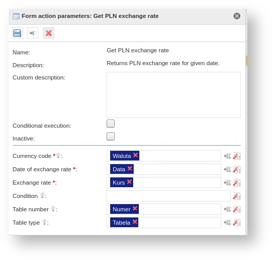 The action returns the zloty exchange rate (PLN) for the given currency and date to the variable. Additionally, they can save the table number and / or the table symbol taken from the NBP.