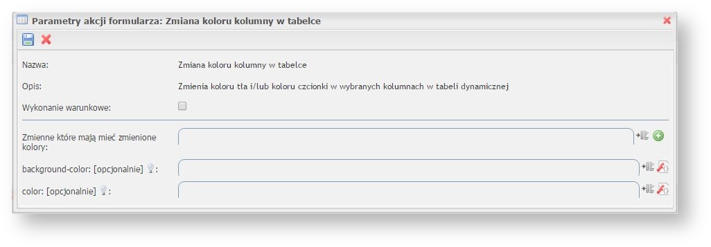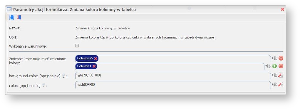 Akcja służy do zmiany koloru czcionki i/lub tła w wybranych kolumnach w tabeli dynamicznej w konkretnym zadaniu.