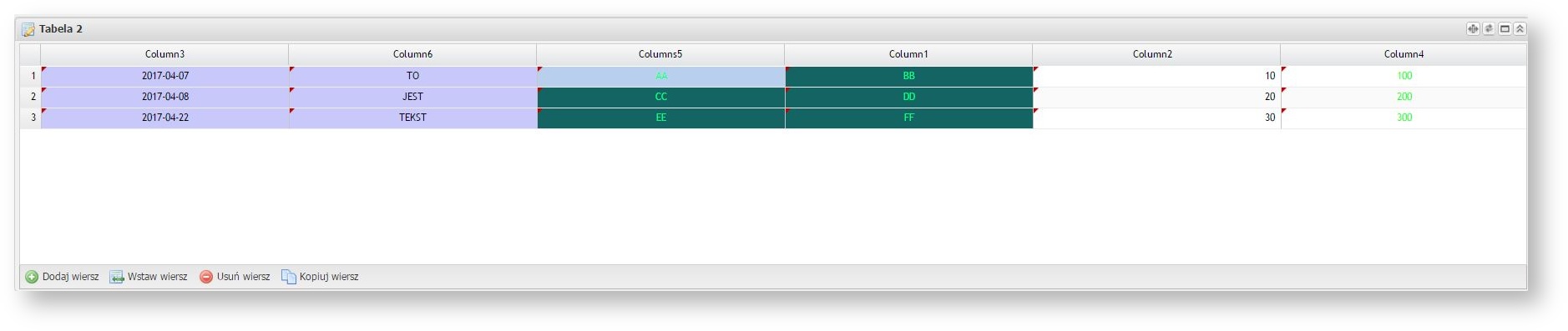 Uwaga! Od wersji 1.0.50. Komponent nie jest już rozwijany i został zastąpiony przez [AKCJA] Kolorowanie wierszy (wtyczka CUF-Components). Należy skorzystać z poniższej dokumentacji tylko w przypadku, gdy komponent został wykorzystany wcześniej przy budowaniu formularza.