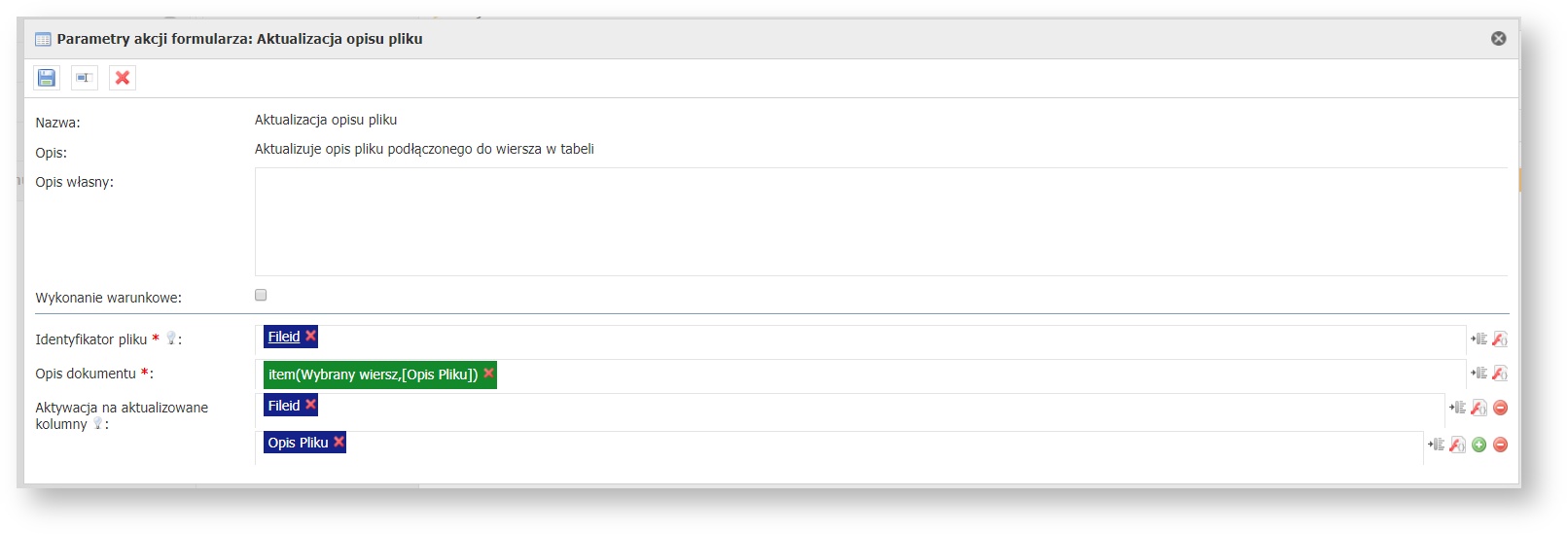 Akcja aktualizuje wybrane opis pliku w podłączonych dokumentach do procesu. Dokument rozpoznawany jest po identyfikatorze pliku który jest mieszczony w tabeli. Każdy wiersz w tabeli to inny dokument do aktualizacji. Akcja posiada zmienną kontekstową "Wybrany wiersz" w celu ewentualnej konfiguracji w zależności od wiersza. Komponent uruchamia się w momencie zmiany wartości w wybranych kolumnach.