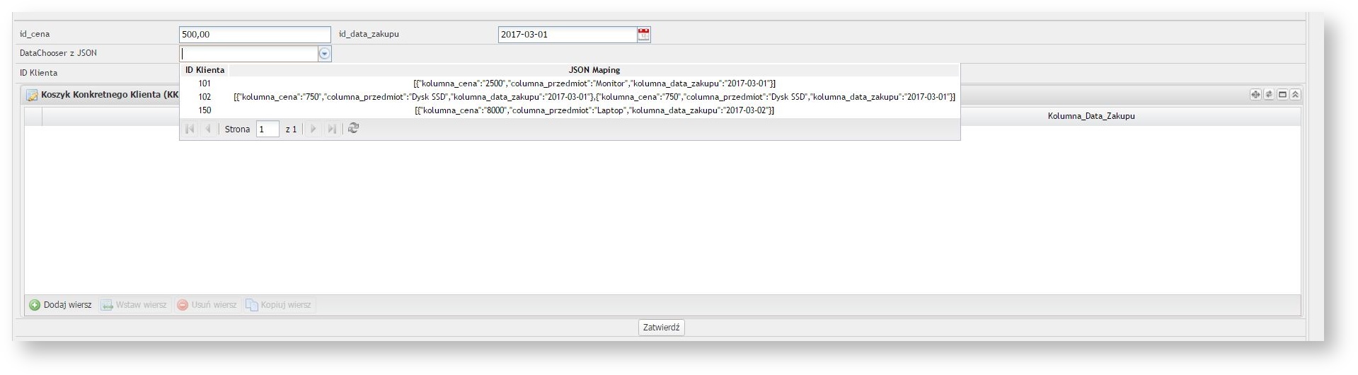 Typ pola STRING_ARRAY . Lista nazw kolumn dla których ma być robione grupowanie danych (wybrane wartości z pozostałych kolumn( w jednej grupie) zostaną użyte do zbudowania JSON'a ). Tylko nazwy z tej listy mogą posłużyć do mapowania wartości i wyświetlaniu w dynamicznej liście.