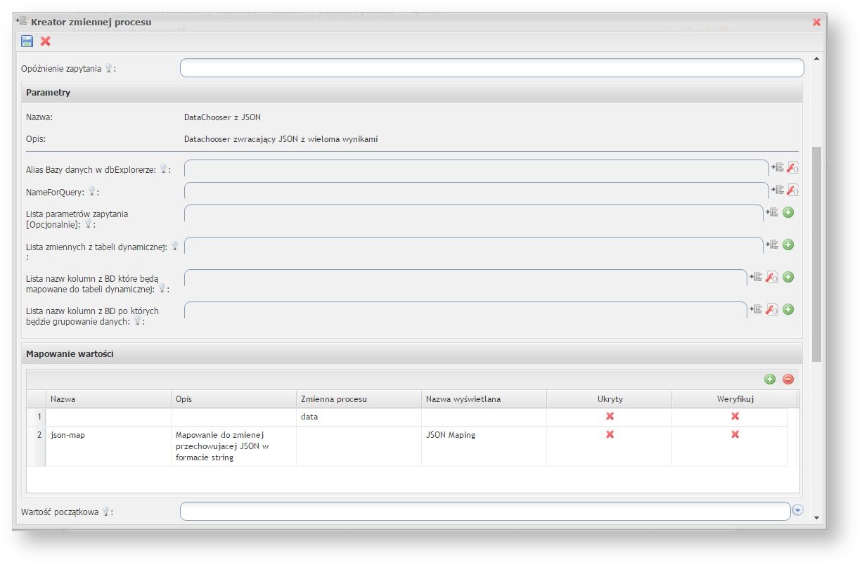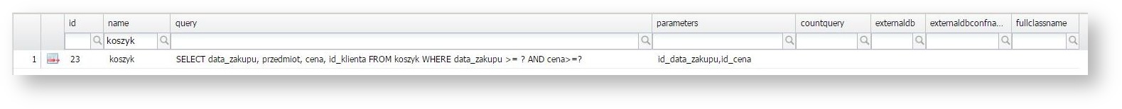 Typ pola STRING. Wartość pola z kolumny "name" z tabeli systemowej "pm_querydatachooser", dla której będą pobierane pola "query" i "parameters" . reszta pól jest ignorowana.