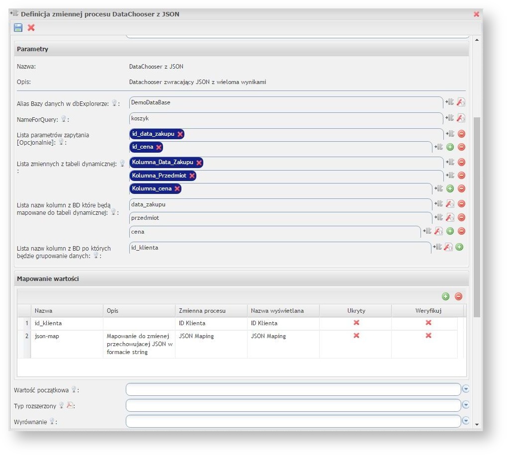 Typ pola VARIABLE_ARRAY. Lista zmiennych dla których identyfikator jest równy wartością z pola "parameters" z tabeli systemowej "pm_querydatachooser". Przy składaniu zapytania SQL, nazwy parametrów zapytania są zmieniane na wartości odczytane z zmiennych o takim identyfikatorze jak nazwa parametru. Wszystkie parametry muszą mieć swój odpowiednik na liście. (Poza parametrami DCKEY które są brane z pola Datachoosera). Przy braku parametrów zapytania można te pole zostawić puste.