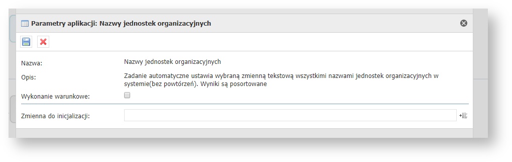 Zadanie automatyczne ustawia wybraną zmienną tekstową wszystkimi nazwami jednostek organizacyjnych w systemie(bez powtórzeń). Wyniki są posortowane