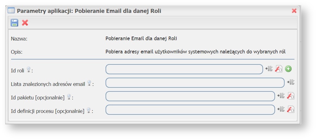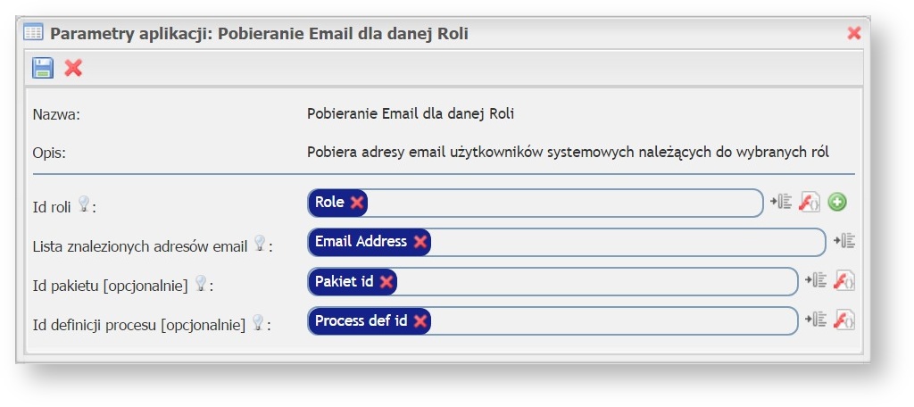 Zadanie wyszukuje adresy e-mail wszystkich użytkowników należących do danej roli. Przy czym można ograniczy wyszukiwanie roli do konkretnego pakietu/procesu