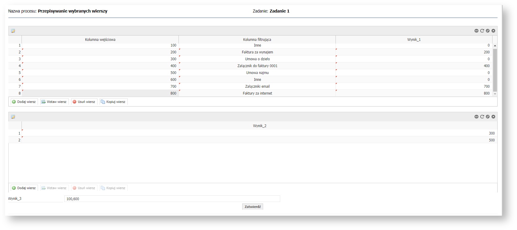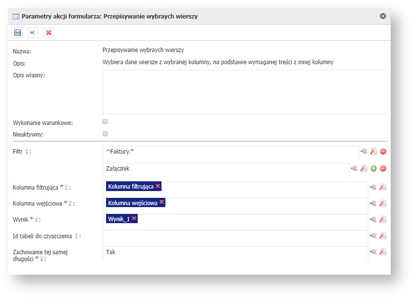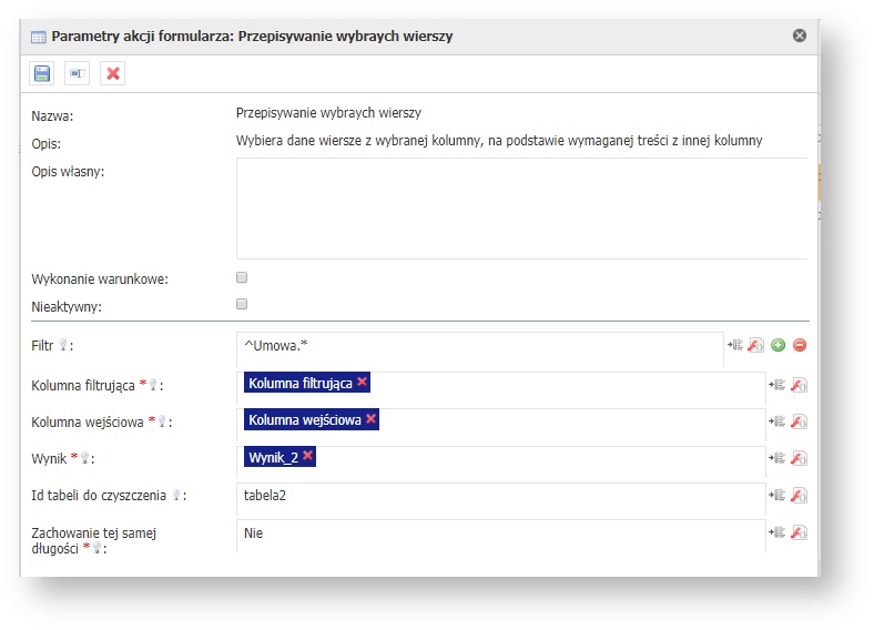 | Kolumna wejściowa* | 1.0.0 | Kolumna z której dane będą przepisane na podstawie kolumny filtrującej. | Zmienna | ||
