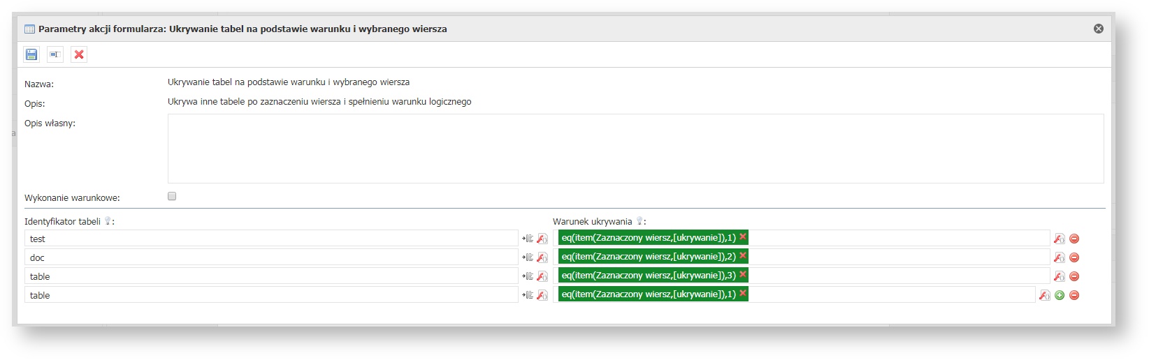 | Warunek ukrywania | 1.0.10 | Funkcja zwracająca warunek boolowski. Prawda - ukryj, Fałsz - pokaż | Funkcja w tabeli | Pole edytowalne | Funkcja zwracająca warunek logiczny. Za każdym zaznaczeniem wiersza, sprawdzane są wszystkie warunki. |