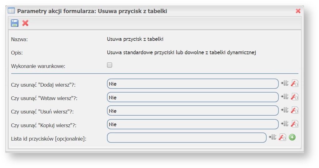 Akcja dodawana jest na "Tabelę Dynamiczną". Akcja zostanie uruchomiona podczas ładowania się formularza, na którym została dodana. Celem akcji jest ukrycie/usuniecie wybranych (w tym domyślnych) przycisków z belki pod wybraną tabelą dynamiczną. W momencie usunięcia wszystkich przycisków belka znika.