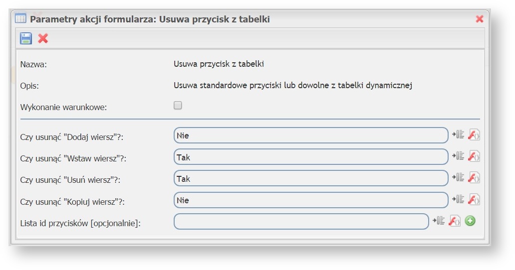 Akcja działa na Tabeli Dynamicznej. Służy ona do usuwania przycisków z tabeli podczas ładowania się formularza