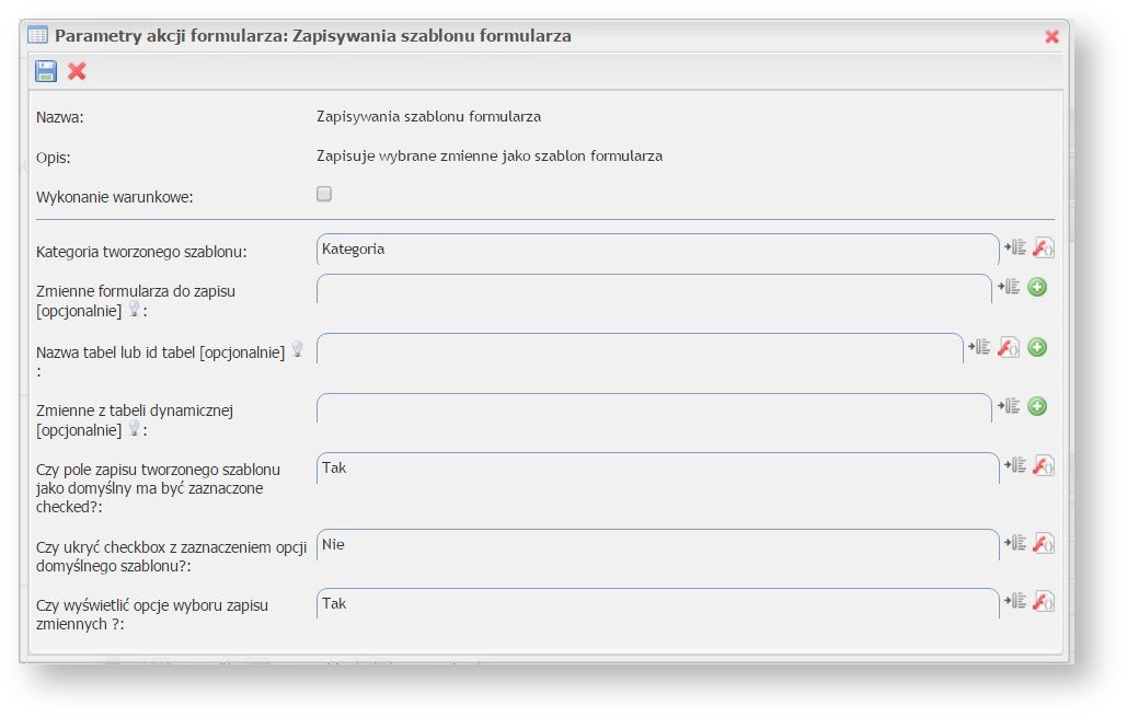 Akcja służy do zapisu wybranych zmiennych i/lub tabel (całych lub wybranych kolumn) jak szablon formularza.