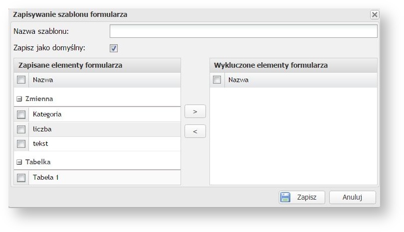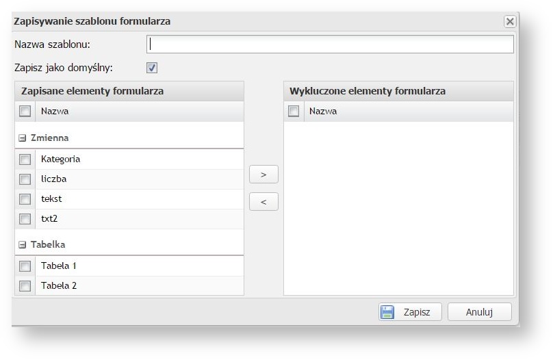 Akcję ustawiamy na przycisk na formularzu. Po kliknięciu w niego, otworzy się okno "Zapisywanie szablonu formularza". W oknie tym podajemy nazwę szablonu oraz zaznaczamy/odznaczamy opcji ustawiająca czy ma być to domyślny szablon (Jeżeli parametry akcji ustawione są ta, żeby tą opcje wyświetlić). Potem możemy zapisać albo anulować procedure. Uwaga Nazwa szablonu za każdym razem musi być inna, bo inaczej zwróci błąd. Przy ustawionym parametrze "Czy wyświetlić opcje wyboru zapisu zmiennych ?:" okno jest rozszerzone od dołu o dodatkowe dwa pola "Zapisane elementy formularza" oraz "Wykluczone elementy formularza". Za pomocą przycisków "strzałek" między tymi polami możemy ustawić które pola mają być zapisane a które nie. Lista zmiennych jest ograniczona przez parametry akcji. Uwaga nie możemy wybrać które kolumny z tabel mają być zapisane,a które nie. Wybór kolumn jest na etapie definicji akcji w PWE.