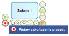 Każdy proces musi posiadać przynajmniej jedno zadanie. Za pomocą przycisków w górnej belce panelu edycji mapy procesu możemy dodawać różne typy zadań. Po kliknięcu jednego z przycisków możemy umieścić element na mapie procesu. Musi on znajdować się nad uczestnikiem. Jeśli element znajduje się na granicy obszarów dwóch uczestników, to obszar uczestnika znajdującego się wyżej zostanie odpowiednio powiększony. Jeżeli umieszczenie elementu w danym miejscu mapy procesu nie jest możliwe, użytkownik jest informowany o tym fakcie znakiem . Zakończenie rysowania elementu zadania odbywa się poprzez użycie klawisza ESC, prawego przycisku myszki lub odkliknięcie przycisku na górnej belce panelu edycji procesu. Należy pamiętać, że poszczególne typy zadań mogą być umieszczane w obszarze określonych użytkowników: