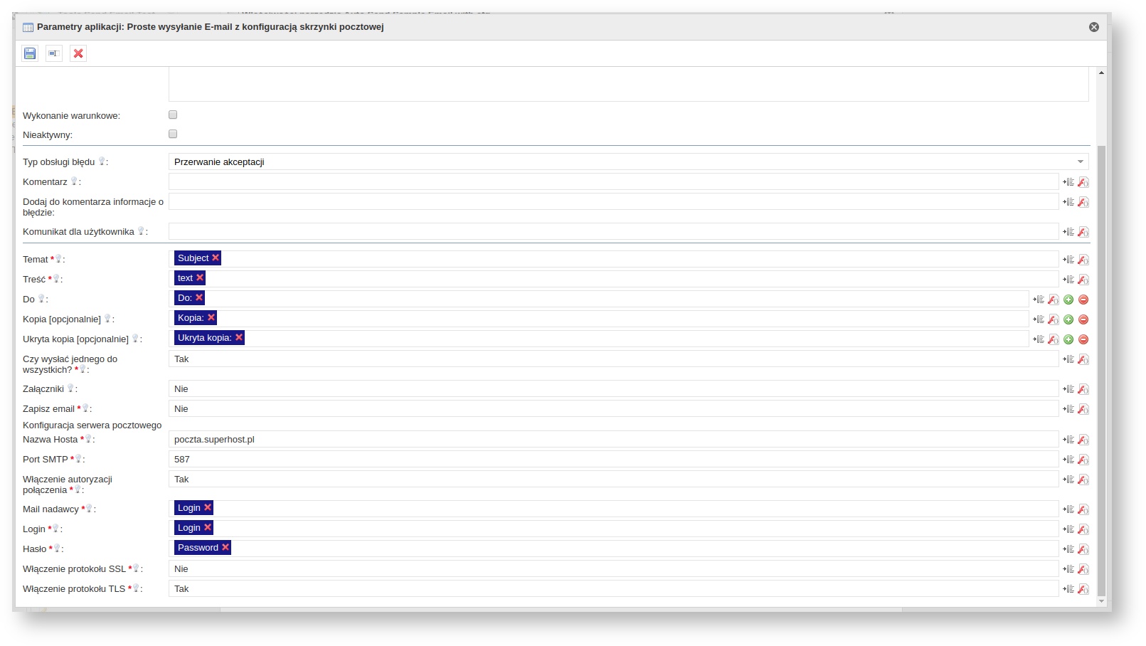 | Hasło * | 1.0.5 | Hasło do serwera pocztowego | Tekst | ****** | Pole edytowalne | Pole nie jest szyfrowane |