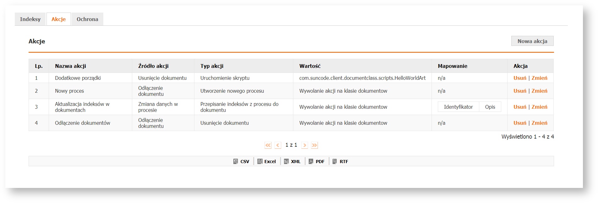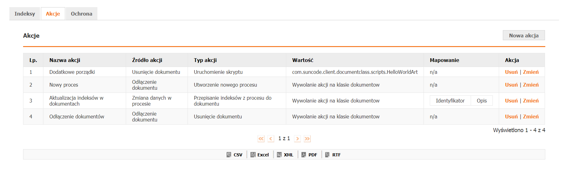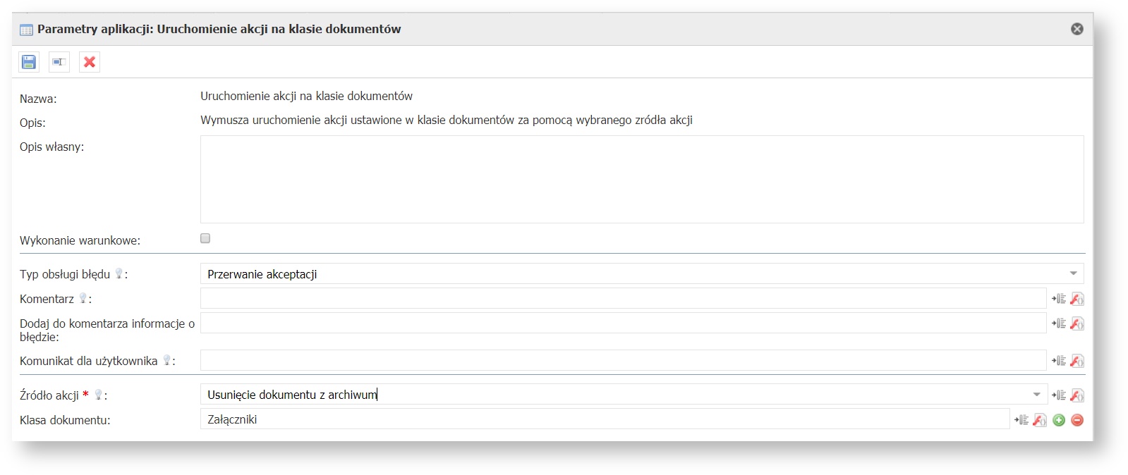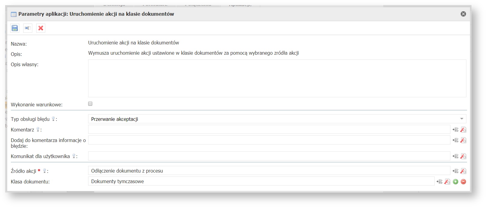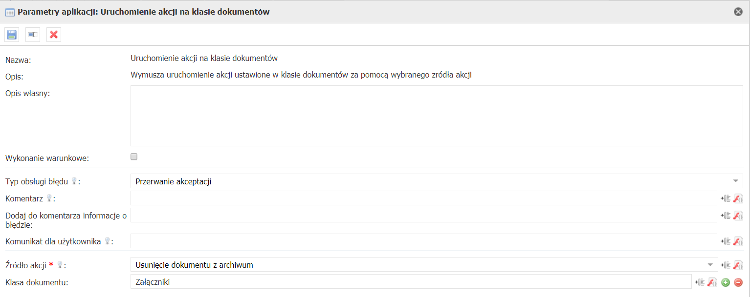 For documents connected to the process, the task forces the action to be run on the document class based on the base of selected source. The task runs only those actions that in the configuration have the same process for which the task is run. In order for the component to work, a document must be added to the process. You can restrict the action to only the documents in the configuration list. Depending on how many matching documents will be added, the action set in the document class will be executed repeatedly. This is useful if you want, for example force the synchronization of indexes on a document.