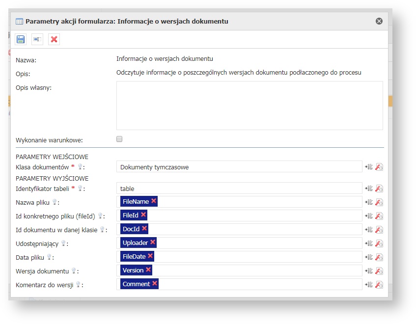Akcja umożliwia odczytanie szczegółowych informacji poszczególnych wersji podłączonych dokumentów. Akcje możemy podłączyć do różnych elementów formularza, w zależności od podłączenia zmienia się parametr wejściowy. Do tabeli zapisywane są informacje ze wszystkich dokumentów należących do wybranej klasy.