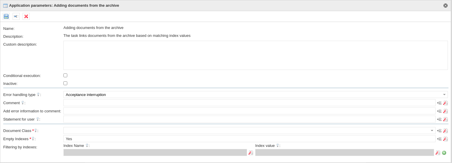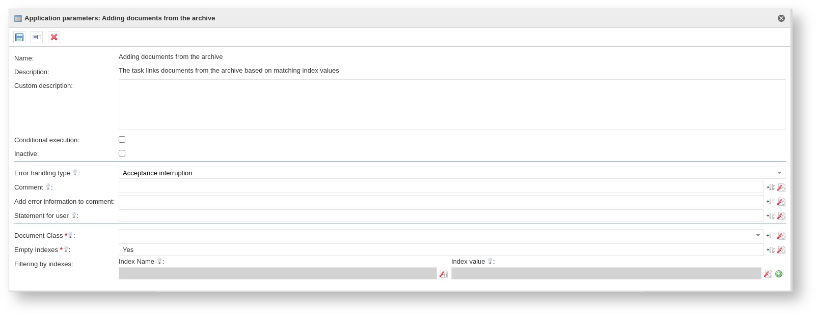 The component is used to connect documents from the archive to the process on the basis of matching indexes. Searches for indexes with blank values. After adding the found documents to the process, it runs actions on them on the document class