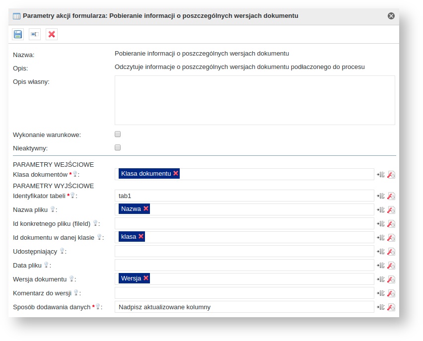 Akcja umożliwia odczytanie szczegółowych informacji poszczególnych wersji podłączonych dokumentów z wybranej klasy dokumentów. Akcje możemy podłączyć do różnych elementów formularza, w zależności od podłączenia zmienia się parametr wejściowy. Do tabeli zapisywane są informacje ze wszystkich dokumentów należących do wybranej klasy. Akcja podłączona na tabele dynamiczną z lista klas działa po zaznaczeniu wiersza.