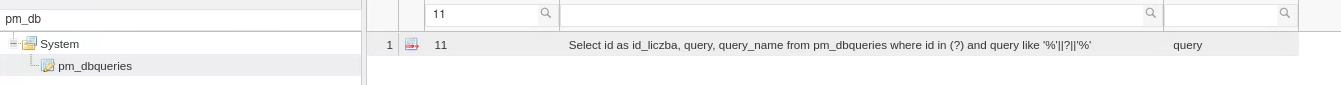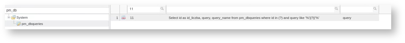 | Query name* | 1.0.14 | Name of the query from the pm_dbqueries table (query_name) | String | ||||||||||