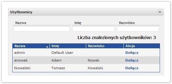 Rysunek 2.3 pokazuje użytkowników w systemie. Za pomocą pól tekstowych możemy filtrować użytkowników. Filtrowanie odbywać się może po nazwie, imieniu, bądź też nazwisku użytkownika. Aby dołączyć danego użytkownika do grupy wystarczy nacisnąć przycisk "Dołącz", znajdujący się przy danej osobie. Po zakończeniu dołączania użytkowników, należy zamknąć okienko za pomocą krzyżyka w prawnym górnym rogu lub kliknąć lewym przyciskiem myszki poza obszarem okna.