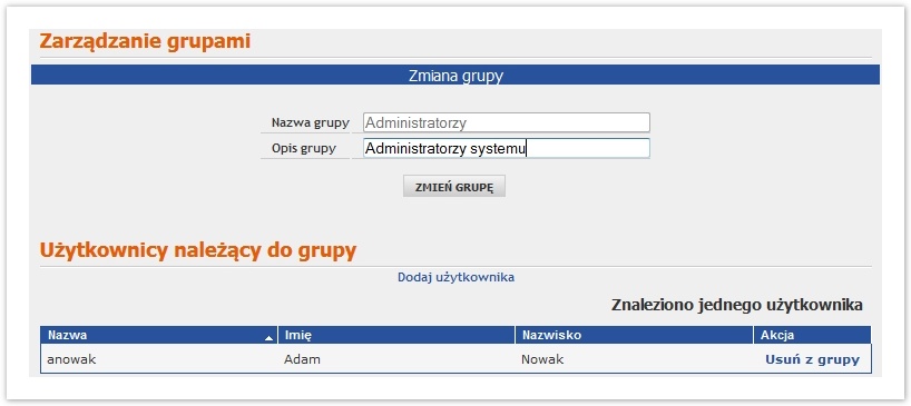 Grupę, którą dodaliśmy możemy edytować. W tym celu należy nacisnąć przycisk "Zmień" znajdujący się w tabeli z grupami w kolumnie "Akcja" (patrz rysunek 2.1). Każdy przycisk odnosi się do wiersza, w którym się znajduje. Po wywołaniu akcji zostanie wyświetlony następujący widok: