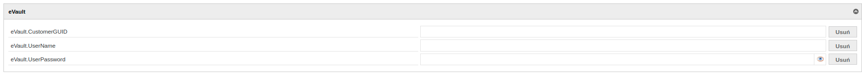Wtyczka służy do integracji z systemem eVault.Konfiguracja autoryzacji dla wtyczki odbywa się po przez parametry systemowe.