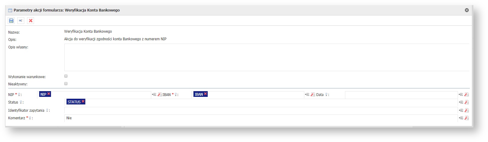 | Status | 1.0.0 | Zmienna do zapisu zwróconego statusu (TAK/NIE/Informacje o błędzie) | Zmienna tekstowa | Gdy nie ustawiona parametru, informacja będzie zwracana w postaci chmurki na formularzu | |